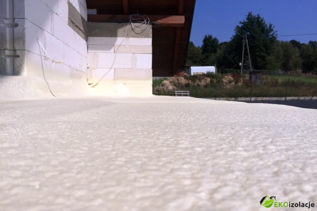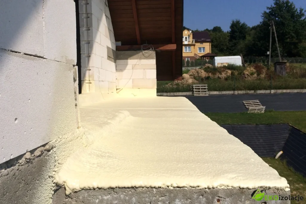 Bardzo dużym mostkiem termicznym jest źle zaizolowany balkon, taras. Na zdjęciach widać jak w całości i spójnie natryskowa pianka PUR zaizoluje balkon. Dodatkowym atutem jest uzyskana hydroizolacja. Po usunięciu zabrudzeń powstałych przy pracach budowlanych został wykonany natrysk o grubości 6cm i to wszystko. Na naszą piankę przyjdzie teraz wylewka właściwa. Często takie prace wykonujemy przy okazji izolacji fundamentów.