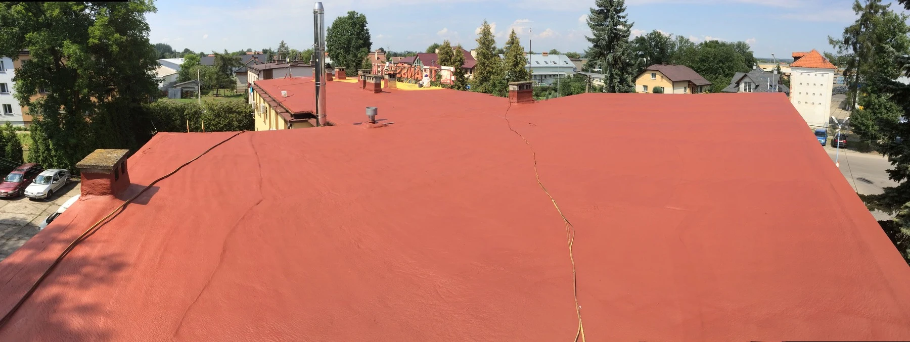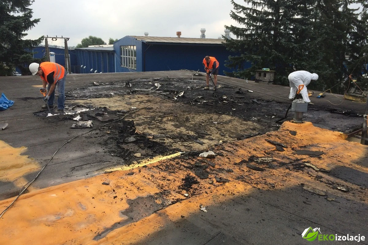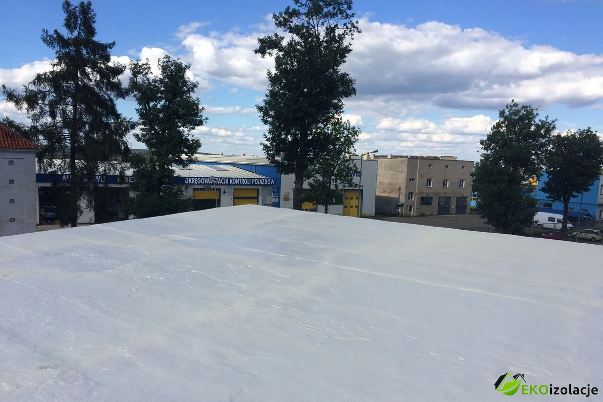 Remont dachu przemysłowego dla firmy TRANSSYSTEM w miejscowości Wola Dalsza k. Łańcuta. Firma EKOizolacje wygrała przetarg na kompleksowy remont dachu o powierzchni 300m² w skład którego wchodziło między innymi pozbycie się dotychczasowej nie szczelnej warstwy izolacji z papy. Przy corocznych naprawach w niektórych miejscach uzbierała się dość gruba warstwa sięgająca do parunastu cm papy tym samym dość mocno obciążająca strop. Po usunięciu starej izolacji, oczyszczeniu dachu oraz zagruntowaniu podłoża przystąpiliśmy do zabezpieczeń elewacji budynku. Wymagane także było na czas natrysku pianki zamknięcie przyzakładowego parkingu. Przy sprzyjających warunkach atmosferycznych został wykonany natrysk 6cm pianki. Kończącym elementem było pomalowanie pianki farbą odporną na promieniowanie UV oraz poprawienie obróbek blacharskich.