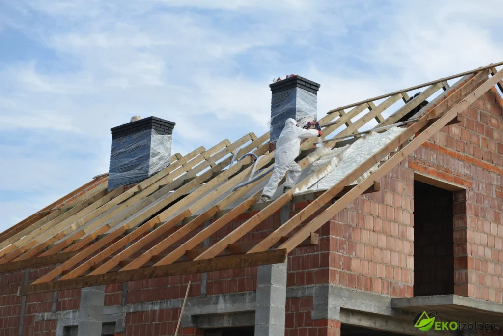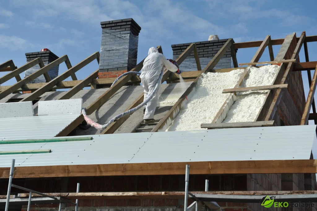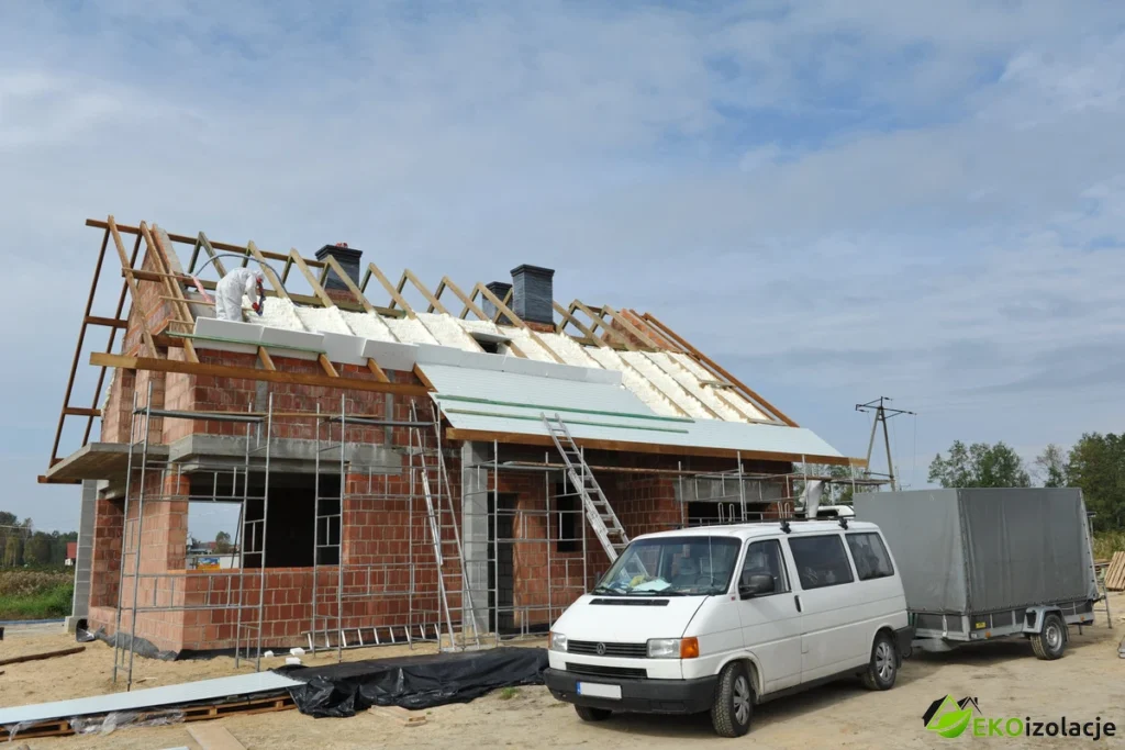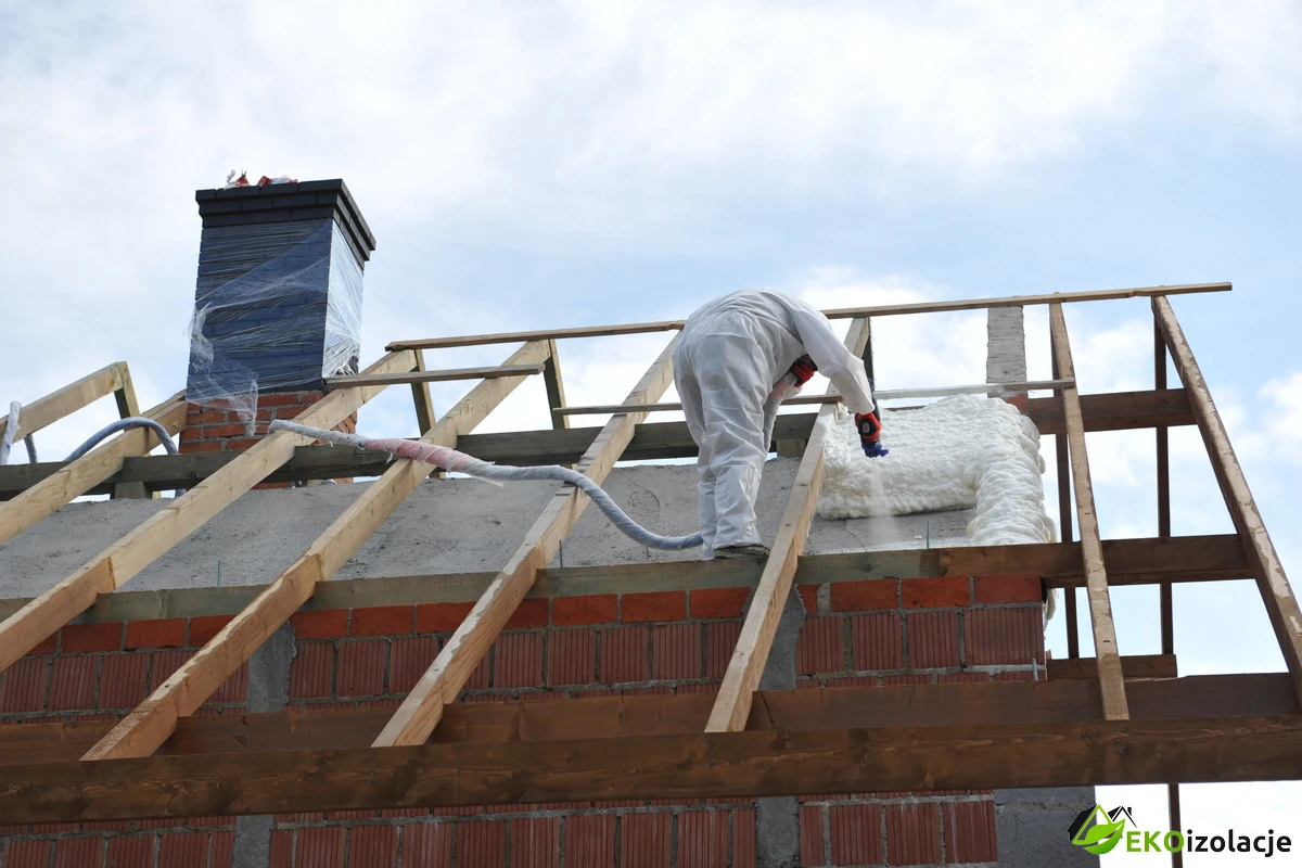 Natrysk odbył się bezpośrednio na betonowy strop, który wcześniej był oczyszczony z zanieczyszczeń powstałych przy pracach związanych z więźbą dachową. Częściowo zawilgocony strop dogrzany był przed natryskiem palnikiem gazowym, celem uzyskania odpowiedniego podłoża pod natrysk pianki. Na górnym stropie klient zadbał o przygotowanie konstrukcji drewnianej, na której położy płytę OSB. Pomiędzy elementy tej konstrukcji została nałożona pianka PUR. Zaraz po aplikacji firma zajmująca się pokryciami dachowymi przystąpiła do zainstalowania foli dachowej, aby nie narażać pianki na warunki atmosferyczne. Zastosowano grubość ocieplenia rzędu 18cm.